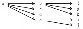 問25 データベースに関する問題属性 a の値が決まれば属性bの値が一意に定まることを,a → b で表す。 例えば,社員番号が決まれば社員名が一意に定まるということの表現は,社員番号 → 社員名である。 この表記法に基づいて,図の関係が成立している属性 a 〜 j を, 関係データベース上の三つのテーブルで定義する組合せとして,適切なものはどれか。 ![]()