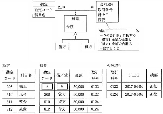 問26 UMLを用いた現金勘定図のデータモデルを三つの表で実装する。このとき,“A 社への売上 50,000 円を, 2017 年4月4日に現金勘定に計上した”ことを記録する“移動”表の a,b の 適切な組合せはどれか。ここで,モデルの表記には UML を用いる。 ![]()