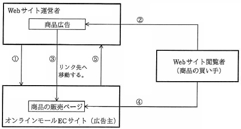 イ アフィリエイトプログラムに同意し参加する。 ウ 希望する商品を購入する。 エ 商品の売上に応じた成功報酬を支払う。 解説