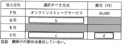 b,c に関する解答群 イ オンラインストレージサービス ウ 暗号化機能付きメールソフト d に関する解答群 エ 300,000 オ 700,000 カ 750,000 キ 1,500,000