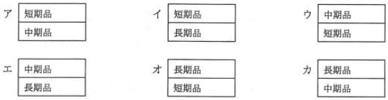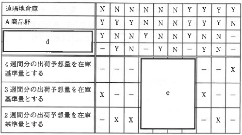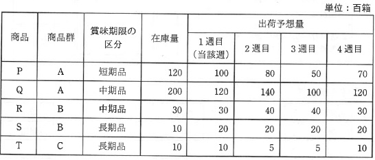 問07 4問選択在庫補充方法の変更に関する次の記述を読んで,設問1〜3に答えよ。 食品メーカのM社では,コスト削減やキャッシュフローの改善を目的として, 自社の在庫補充方法を変更して在庫量の削減を図ることにした。従来は,毎週月曜日に, 保管を委託している全ての配送倉庫の全商品について,配送倉庫ごとに, 当該週を含む4週間分の出荷予想量と在庫量を比較し,出荷予想量に満たない量を工場から補充していた。 このたびM社では,出荷予想量を算出する期間を見直し,配送倉庫,商品群,賞味期限ごとに在庫基準量を設定し, 在庫量が在庫基準量に満たない場合,その差を在庫補充量として補充することにした。 この新しい在庫補充方法を次に示す。 〔新しい在庫補充方法〕 (1) 販売量が多い商品群 A,中程度の商品群 B,少ない商品群 C の商品群別に管理する。 (2) 賞味期限が短い商品(以下,短期品という)は,全ての商品群について2週間分の出荷予想量を 在庫基準量とする。 (3) 賞味期限が中程度の商品(以下,中期品という)は,商品群Aについて2週間分の出荷予想量を, 商品群 B 及び C について3週間分の出荷予想量を在庫基準量とする。 (4) 賞味期限が長い商品(以下,長期品という)は,全ての商品群について3週間分の出荷予想量を 在庫基準量とする。 (5) 配送倉庫の中には,工場から遠く,すぐに在庫を補充できない配送倉庫(以下,遠隔地倉庫という)がある。 遠隔地倉庫における商品群 A の商品の在庫基準量は,(2) 〜 (4) にかかわらず次のとおりとする。 A 中期品は,3週間分の出荷予想量を在庫基準量とする。 B 長期品は,4週間分の出荷予想量を在庫基準量とする。