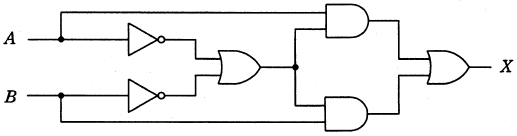 A、B の各値を図に示すディジタル回路に入力すると以下のようになる。 回路は、上下対象なので、0,1と1,0の出力は同じである。
