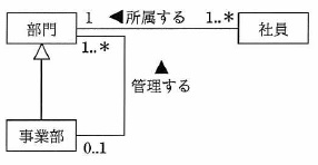 問28 UMLを用いた図のデータモデルUMLを用いて表した図のデータモデルの解釈のうち,適切なものはどれか。 ![]() イ 社員は事業部に所属できる。 ウ 所属する社員がいない部門が存在する。 エ 部門は,いずれかの事業部が管理している。 解説