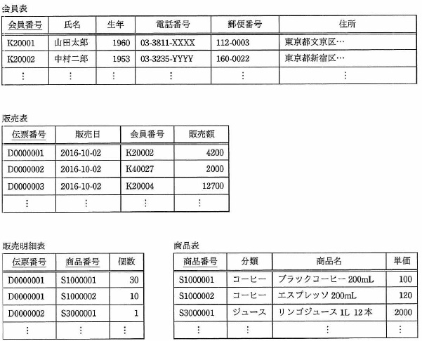 問03 4問選択会員制通信販売事業者における会員販売データ管理に関する次の記述を読んで, 設問1〜4に答えよ。 清涼飲料水の会員制通信販売事業を運営するD社では,販売促進と商品管理の効率化を 目的に会員情報や販売情報を管理するシステム(以下,販売管理システムという)を, 事業開始当初から導入している。注文の受付は電話応対で行い, 電話の受付時間は8時から 20 時までである。 販売管理システムで利用するデータベースの表構成とデータ格納例を,図1に示す。 下線付きの項目は主キーである。