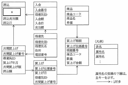 問05 4問選択買上げ・入金管理システムを用いた月次集計処理に関する次の記述を読んで,設問1,2に答えよ。 E社は,10 年以上の取引実績がある得意先とは,双方が合意した上で,得意先の 買上げに対する支払を,1回の入金で行うことも,複数回の入金で行うことも許容した取引を行っている。 得意先は,入金を,買上げ前にも買い上げ後にも行うことができる。 E社の担当者は,得意先の買上げ及び入金が発生するたびに, 買上げ・入金管理システムに記録している。 毎月の最終営業日の取引終了後に,買上げ・入金管理システムを用いて月次集計処理を行っている。 月次集計処理の概要は次のとおりである。 〔月次集計処理の概要〕 月次集計処理は月間買上げ額確定処理と消込み処理から成り, 月間買上げ額確定処理の終了後に消込み処理を行う。 月間買上げ額確定処理は,得意先ごとに当月1か月分の買上げ金額を合計して, 当月の買上げの合計額(以下,月間買上げ額という)を確定させる処理である。 消込み処理は,充当が完了していない月間買上げ額に対して,得意先からの入金を 充当していく処理である。 E社の得意先との取引では,過去の月間買上げ額に対する充当が完了していない場合や, 逆に得意先から入金された金額が,全ては月間買上げ額に充当されずに残っている場合がある。 したがって,消込み処理では,充当が完了していない月間買上げ額に対して, 買上げ年月の古い順に,まだ入金額の全てを充当しきれていない入金を, 入金日が古い順に充当していく。 〔買上げ・入金管理システムのデータベース〕 買上げ・入金管理システムでは,関係データベースの表で必要なデータを管理している。 関係データベースの E-R 図を図1に,各表の説明を表1に,主な表の属性の説明を表2に示す。