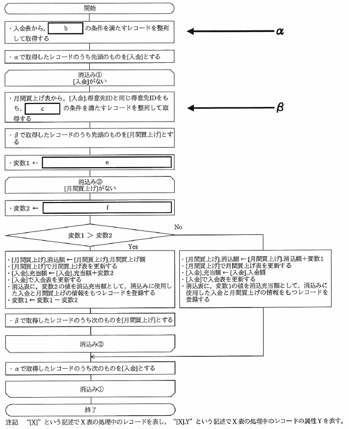 図2中のαの部分では,入金表から b の条件を満たすレコードを, 得意先 ID の昇順,入金日の昇順に整列して取得する。消込み@の繰返し処理では, 取得したレコードを順に処理する。βの部分では,消込み@の繰返しで処理中の レコードの得意先 ID と同じ得意先 ID を もつ月間買上げ表のレコードのうち, c の条件を満たすレコードを, d に整列して取得する。 消込みAの繰返し処理では,取得したレコードを順に処理する。