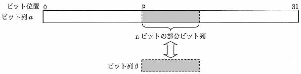![]() 図1 部分ビット列の検索の概要 (1) 主プログラムは,αが格納されている領域の先頭アドレスを GR1 に, βを GR2 に,βの長さ n( 1 ≦ n ≦ 16)を GR3 に設定して副プログラム BSRH を呼ぶ。 βは GR2 に左詰めで設定し,残りのビットには 0 を設定する。 (2) 副プログラム BSRH は, αの先頭(ビット位置 0 )からβと照合し, 一致する部分ビット列がある場合は最初に一致する部分ビット列の先頭のビット位置 p を, 一致する部分ビット列がない場合は −1 を,GRØ に設定して主プログラムに戻る。 (3) 副プログラム BSRH から戻るとき,汎用レジスタ GR1 〜 GR7 の内容は元に戻す。 〔プログラム1〕 (行番号)
