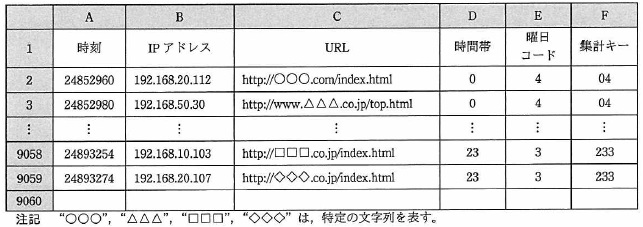 ![]() 図1 ワークシート“ログ”の例 (1) 行 1 は見出し行で,データは行 2 以降に入力されている。 (2) 列 A には,PC がサーバにアクセスした時刻が入力されている。ここで,時刻は, 基準となる 1970 年 1 月 1 日(木曜日)の 0 時 00 分から当該時刻までの分を 単位とする経過時間で表現する。 (3) 列 B には,社外の Web ページにアクセスした PC の IP アドレスが入力されている。 (4) 列 C には,アクセスした Web ページの URL が入力されている。 (5) 列 D には,列 A の時刻に対応する時間帯( 0 〜 23 )を表示する式が入力されている。 ここで,時間帯は,0 時台( 0 時 00 分〜 0 時 59 分)を 0,1 時台( 1 時 00 分〜 1 時 59 分)を 1,…,23 時台( 23 時 00 分〜 23 時 59 分)を 23 とする整数値である。 (6) 列 E には,列 A の時刻に対応する曜日を 0 〜 6 の整数値で表現する曜日コードを 表示する式が入力されている。ここで,曜日コードは, 基準となる 1970 年 1 月 1 日の曜日である木曜日を 0 とし,水曜日の 6 までを順に割り振る。 (7) 列 F には,時間帯と曜日コードをつないで一つの文字列とした集計キーを 表示する式が入力されている。 (8) データは最大 9,998 件までとし,データの最終行よりも下の行の列 A 〜 C の各セルには 空値が入力されている。 〔ワークシート:曜日) 曜日と曜日コードとの対応を,ワークシート“曜日”に入力する。 ワークシート“曜日”を,図2に示す。