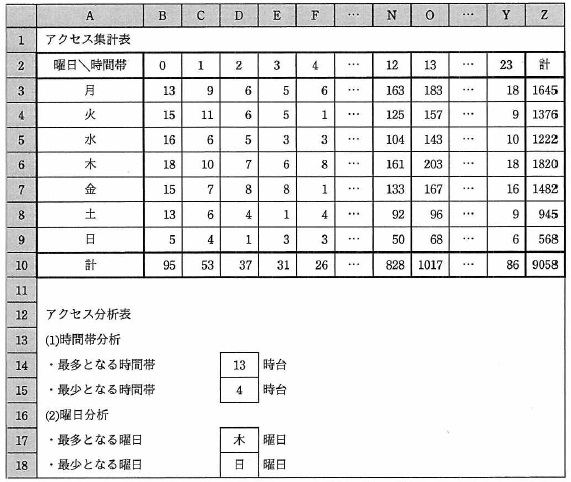 ![]() 図3 ワークシート“集計”の例 (1) “アクセス集計表”は,ワークシート“ログ”を参照して,社外の Web ページに アクセスした回数(以下,アクセス回数という)を,該当する曜日, 時間帯ごとに集計して表示する。 (2) “アクセス分析表”は,アクセス回数が,最多となる時間帯と最少となる時間帯, 及び最多となる曜日と最少となる曜日を表示する。 (3) セル A3 〜 A9 には,曜日として“月”〜“日”を入力する。 (4) セル B2 〜 Y2 には,時間帯として 0 〜 23 を入力する。 (5) セル B3 には,ワークシート“ログ”のデータの中から,曜日と時間帯がそれぞれ, 当該セルと同じ行の列 A で示す曜日と,同じ列の行 2 で示す時間帯に一致するデータの 個数を数えて表示する次の式を入力して,セル B3 〜 Y9 に複写する。 (6) セル Z3 には,当該セルと同じ行の列 B 〜 Y の値を合計する式を入力し, セル Z4 〜 Z9 に複写する。 (7) セル B10 には,当該セルと同じ列の行 3 〜 9 の値を合計する式を入力し, セル C10 〜 Z10 に複写する。 (8) セル D14 には,アクセス回数を時間帯ごとに集計したときに, その値が最多となる時間帯を表示する式を入力し, セル D15 にはその値が最少となる時間帯を表示する式を入力する。 ここで,最多,最少となる時間帯が複数あったときは, そのうちアクセス集計表の左端に最も近い時間帯を表示する。 (9) セル D17 には,アクセス回数を曜日ごとに集計したときに, その値が最多となる曜日を,“月”〜 “日”で表示する次の式を入力する。 セル D18 には,アクセス回数を曜日ごとに集計したときに,その値が最少となる曜日を, “月”〜 “日”で表示する式を入力する。 ここで,最多,最少となる曜日が複数あったときは,そのうちアクセス集計表の 上端に最も近い曜日を表示する。 b に関する解答群 イ =結合(B$2,照合検索($A3,曜日!$B$2:$H$2,曜日!$B$1:$H$1)) ウ =結合(B$2,水平照合($A3,曜日!$B$1:$H$2,2,0)) エ =結合(照合一致($A3,曜日!$B$1:$H$1,0),B$2) オ =結合(照合検索($A3,曜日!$B$2:$H$2,曜日!$B$1:$H$1),B$2) カ =結合(水平照合($A3,曜日!$B$1:$H$2,2,0),B$2) c に関する解答群 イ 照合検索(最大(Z3:Z9),Z3:Z9,A3:A9) ウ 照合検索(照合一致(最大(Z3:Z9),Z3:Z9,0)−1,曜日!B2:H2,曜日!B1:H1) エ 表引き(A3:Z9,1,照合一致(最大(Z3:Z9),Z3:Z9,0))