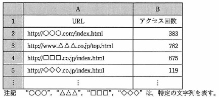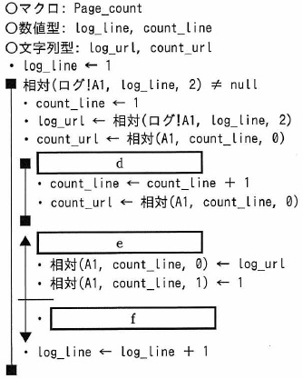 ![]() d に関する解答群 イ 論理積(count_url = null, count_url ≠ log_url) ウ 論理積(count_url ≠ null, count_url ≠ log_url) エ 論理和(count_url = null, count_url = log_url) オ 論理和(count_url = null, count_url ≠ log_url) カ 論理和(count_url ≠ null, count_url ≠ log_url) e に関する解答群 イ count_url = null ウ count_url ≠ null エ log_url = null オ log_url ≠ null f に関する解答群 イ 相対(A1, count_line, 1) ← 相対(ログ!A1, log_line, 2) ウ 相対(A1, count_line, 2) ← 相対(A1, count_line, 2) + 1 エ 相対(A1, count_line, 2) ← 相対(ログ!A1, log_line, 2) オ 相対(A1, log_line, 1) ← 相対(A1, log_line, 1) + 1 カ 相対(A1, log_line, 2) ← 相対(A1, log_line, 2) + 1