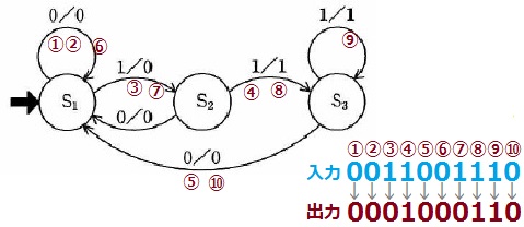 問04 状態遷移図で示されるオートマトン入力記号,出力記号の集合が{0,1}であり,状態遷移図で示されるオートマトンがある。 0011001110 を入力記号とした場合の出力記号はどれか。ここで,S1 は初期状態を表し, グラフの辺のラベルは,入力/出力を表している。