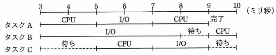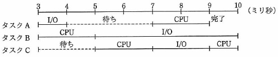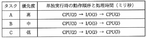 問16 スケジューリング状況三つのタスクA〜Cの優先度と,各タスクを単独で実行した場合の CPU と入出力(I/O)装置の 動作順序と処理時間は,表のとおりである。A〜Cが同時に実行可能状態になって3ミリ秒経過後から 7ミリ秒間のスケジューリングの状況を表したものはどれか。ここで,I/O は競合せず, OS のオーバヘッドは考慮しないものとする。また,表の( )の数字は処理時間を表すものとし, 解答群の中の“待ち”はタスクが実行可能状態にあり,CPU の割当て待ちであることを示す。