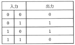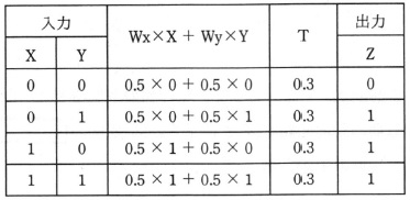 Wx × X + Wy × Y < T のとき,0 を Z に出力する。 例えば,パラメタ Wx が 0.5,Wy が 0.5,T が 0.3(以下,パラメタ〔0.5,0.5,0.3〕のように表記する) の場合には,表3に示すとおり,この論理回路における入力と出力の関係(以下,入出力関係という)は OR(論理和)になる。