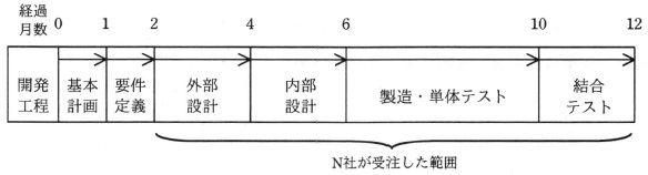 EVM(Earned Value Management)手法を用いたプロジェクト管理に関する次の記述を読んで, 設問1〜3に答えよ。 S社では,クライアントサーバシステムとして構築されている既存の営業システムを, Web システムに刷新するプロジェクト(以下,刷新プロジェクトという)を立ち上げた。 Web システムとして構築する営業システムを,新営業システムと呼ぶ。 N社は,この刷新プロジェクトにおける外部設計から結合テストまでを受注した。 〔刷新プロジェクトへのN社の対応〕 (1) S 社から提示された刷新プロジェクトの結合テストまでのスケジュールは,図 1のとおりである。