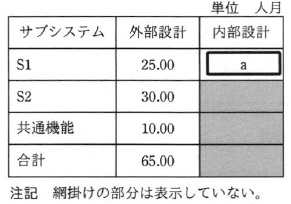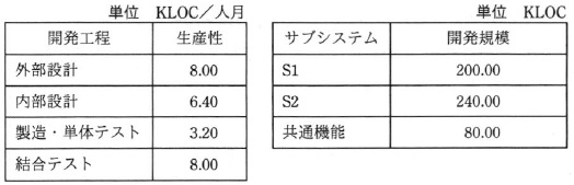 ![]() 図1 刷新プロジェクトの結合テストまでのスケジュール (2) 新営業システムは,サブシステム S1(以下,S1 という),サブシステム S2(以下,S2 という)及び 共通機能の三つのサブシステムで構成される。N 社はこの構成に合わせて外部設計から結合テストまでを 実施するプロジェクト(以下,プロジェクトという)体制を構築し,プロジェクトマネージャは, システム企画部に所属する Y 君が担当する。 (3) N 社では,新営業システムと類似する Web システムの開発をこれまで複数案件行っており, 組織のプロセス資産として各開発工程の生産性のデータを保有している。 N 社が保有する各開発工程の生産性を,表1に示す。Y 君は,要件定義の成果物である要件定義書と N 社の過去の開発実績を参考にして,表2に示すとおりに新営業システムの開発規模を 見積もった。ここで,KLOC(Kilo Lines Of Code)は ,ソースコード 1,000 行を単位とする指標である。