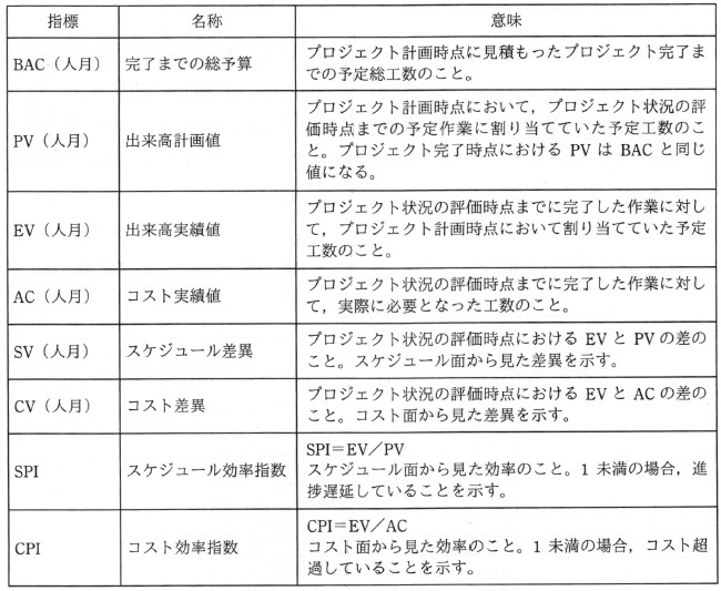 N 社では,進捗遅延やコスト超過を早期に検出することを目的として,EVM 手法を 用いたプロジェクト管理を行っている。EVM 手法では,プロジェクトの計画と実績について, 定量的な情報を用いて進捗状況やコスト状況を分析し,評価する。 EVM 手法で使う各指標(以下,EVM 指標という)の N 社での意味を,表4に示す。