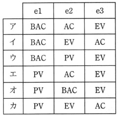 c,d に関する解答群 ウ EV(出来高実績値) エ AC(コスト実績値) オ SV(スケジュール差異) カ CV(コスト差異) e に関する解答群 ![]()
