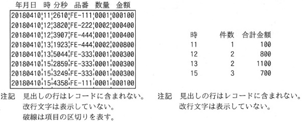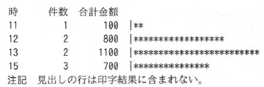 図3に示す,時分秒のうちの時をキー項目として昇順に整列済みのレコードを 入力ファイルから読み込み,時間帯( 0 時台,1 時台,…,23 時台)ごとの件数と 金額の合計(合計金額)を求め,時,件数,合計金額と合計金額を表す棒グラフを印字する。 この処理を,次の手順で行う。 (1) プログラム1を利用して,図3の入力ファイルから,図4の集計ファイルを得る。 (2) プログラム2を利用して,図4の集計ファイルから,図5の印字結果を得る。