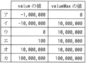 プログラム2は,作成途中である。図4の集計ファイルを用いると図5の印字結果が 得られるが,集計ファイル中の合計金額の値によっては,コメント /* α */ を 付した印字処理の実行時に問題が発生する場合がある。 〔プログラム2の説明〕の (2) にある前提“集計ファイル中の合計金額の値の 最大値は正であり,最小値は 0 以上である”が満たされない場合も考慮に含め, コメント /* α */ を付した印字処理の実行時に発生し得る事象として, @算術演算であふれが発生,A算術演算でゼロ除算が発生,B配列の定義外の要素位置を参照,がある。 これらの事象が発生し得る value と valueMax の値の例を,表1にまとめた。 ここで,long 型の数値の範囲は,−231〜231 − 1 (231=2,147,483,648)とする。