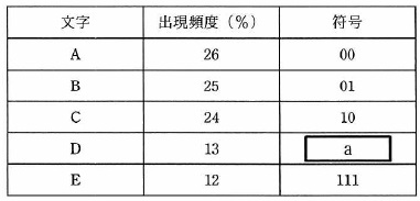 問04 ハフマン符号化による圧縮出現頻度の異なる A,B,C,D,E の5文字で構成される通信データを,ハフマン符号化を 使って圧縮するために,符号表を作成した。a に入る符号として,適切なものはどれか。