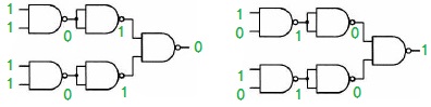 問題の各回路に、A と B に1を入力する。また、A と B に1、0を入力すると 「イ」が NAND 回路の構成になる。