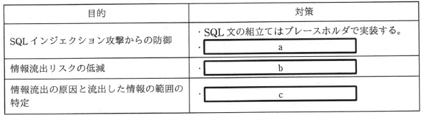 a に関する解答群 イ Web サーバのメモリを直接操作するような命令を記述できないプログラム言語を用いて, Web アプリを作り直す。 ウ Web ページに出力する要素に対して,エスケープ処理を施す。 エ データベース操作の命令文の組立てを文字列連結によって行う場合は, 連結する文字列にエスケープ処理を施す。 b に関する解答群 イ カタログ請求者の情報を,カタログ送付後に直ちに,データベースから消去する。 ウ カタログ請求者へ送付する電子メールにディジタル署名を付ける。 エ データベースに登録されている情報を定期的にバックアップする。 c に関する解答群 イ Web サーバと DB サーバにインストールするミドルウェアは,必要最低限にする。 ウ Web サーバと DB サーバのハードディスクのデフラグメンテーションを,定期的に行う。 エ データベースヘのアクセスログを取得する。