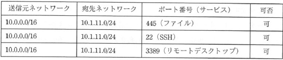 問04 4問選択ネットワークの障害分析と対策に関する次の記述を読んで,設問に答えよ。 G社は,ソフトウェア開発会社である。G社のネットワーク構成を図1に示す。 ![]() 図1 G社のネットワーク構成 (1)図1中の各セグメントには,図に記された機器を含む複数の機器が配置されており, 各機器はセグメントごとに用意されたスイッチに LAN ケーブルで接続されている。 (2)社員は,事務作業を事務セグメント内の PC を使用して行い,ソフトウェア開発作業を 開発プロジェクトごとに設けられた開発セグメント内の PC を使用して行う。 現在,開発セグメントは,開発セグメント1から開発セグメント 10 まである。 (3)事務セグメント内の PC は,リモートデスクトップ(手元の PC をクライアントとして, 他の PC を GUI で遠隔操作する技術であり,操作される側がサーバになる)の クライアント機能(以下,リモートデスクトップ機能という)又は SSH を用いて, 開発セグメント内の PC を遠隔操作できる。 (4)開発セグメント内の PC は,事務セグメント内のファイルサーバにアクセスできる。 (5)事務セグメント内の PC からインターネット上に公開された Web サイトを閲覧する際には, DMZ セグメント内のプロキシサーバを経由する。 (6)ルータ B は,内蔵のパケットフィルタ型のファイアウォール機能によってセグメント間の 通信の可否を制御しており,上記(3)〜(5)に必要な通信だけを許可している。 ルータ B のファイアウォール機能は,送信元ネットワークから,宛先ネットワークの 指定したポート番号への通信の可否を制御するものであって,許可した通信の応答パケットの通過も許可する。 〔障害の発生〕 ある日,“事務セグメント内の PC B-1 から, リモートデスクトップ機能を用いて, 開発セグメント1内の PC 1-1 を遠隔操作しようとしたが,接続できなかった”と報告があったので, 障害箇所を特定するために原因の切分けを行った。 初めに,事務セグメント内の PC B-2 から,PC 1-1 にリモートデスクトップ機能を 用いて接続を試みたが,失敗した。 次に,PC B-1 から SSH を用いてログインした開発セグメント1内の PC 1-2 で ping コマンドを実行し,PC 1-1 から応答が返ってくることを確認した。 これらのことから,障害の原因として a や b の不具合が考えられたので, これらに不具合があるかどうかを調査して,原因を特定した。 〔セグメントの追加〕 新しい開発プロジェクトの立上げに伴い,開発セグメント 11 をネットワークに追加した。 開発セグメント 11 は,開発セグメント 1 〜 10 と同様にスイッチ 11 でルータ B と接続する。 ルータ B のファイアウォールに追加した設定を表1に示す。ところが,表1の設定には誤りがあり, 開発セグメント 11 に接続された PC に関して,c ことが分かった。 事務セグメントと開発セグメント 11 のネットワークアドレスは,表2のとおりである。