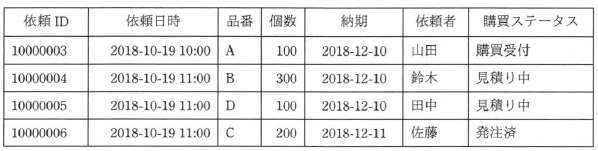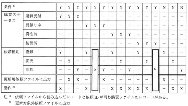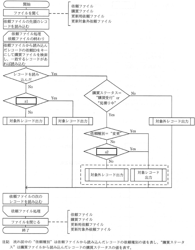(2)購買ステータスには,購買部門が発注先に見積りを依頼する前は“購買受付”が, 見積りを依頼して発注するまでの間は“見積り中”が,発注して納品されるまでの間は “発注済”が,納品後は“納品済”が設定される。 〔購買ファイル更新可否チェック処理の概要〕 (1)依頼ファイルのレコードの,依頼 ID と依頼種別を除く項目の内容は,正しいものとする。 (2)依頼 ID の昇順に整列された依頼ファイルのレコードを先頭から順に読み込んで, 全てのレコードについて次の処理を行う。 依頼ファイルから読み込んだレコードの依頼種別が“登録”であれば, そのレコードを対象レコード出力処理を使って更新用依頼ファイルに出力する。 A 購買ファイルに同じ依頼 ID をもつレコードがある場合 購買ステータスが“購買受付”又は“見積り中”で,依頼ファイルから読み込んだレコードの 依頼種別が“変更”又は“削除”であれば, そのレコードを対象レコード出力処理を使って更新用依頼ファイルに出力する。 B @ とAの処理で更新用依頼ファイルに出力しなかったレコードを,対象外レコード出力処理を 使って更新対象外依頼ファイルに出力する。