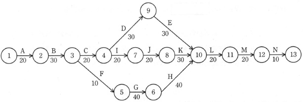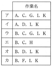 ![]() 図2 作成途中のアローダイアグラム 作成途中のアローダイアグラムには,二つのダミー作業が欠けている。 りん議書電子化プロジェクトのスケジュールを正しく表現するためには, e と f にダミー作業を追加する必要がある。 ダミー作業追加後のアローダイアグラムにおいて,りん議書電子化プロジェクトの総所要日数は, g 日である。 e,f に関する解答群 ウ 結合点 4 から結合点 5 エ 結合点 4 から結合点 6 オ 結合点 6 から結合点 7 カ 結合点 6 から結合点 8 キ 結合点 6 から結合点 12 ク 結合点 7 から結合点 9