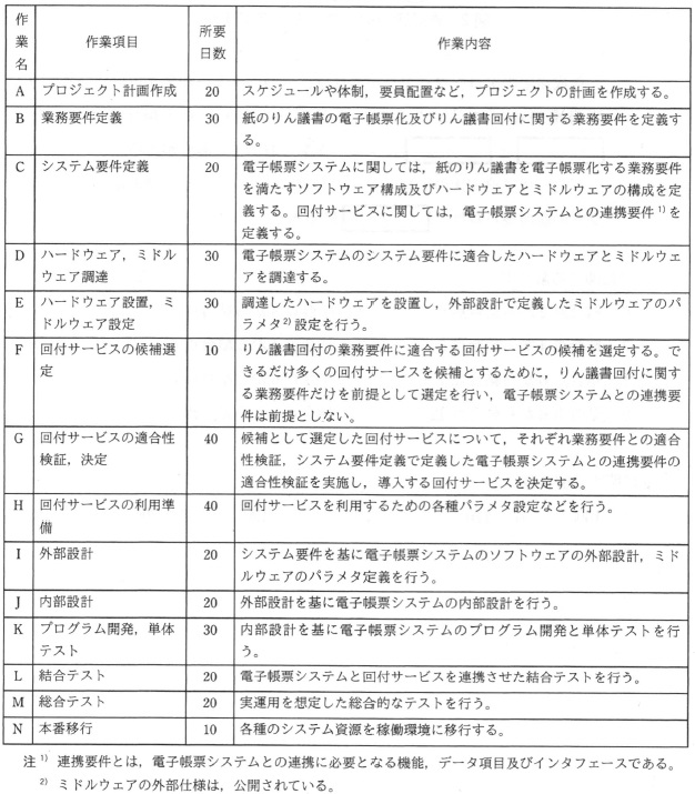 問06 4問選択プロジェクトのスケジュール作成に関する次の記述を読んで,設問1,2に答えよ。 W社は,業務効率化を目的として,紙のりん議書を回付して行っている申請承認に 関わる業務を電子化するプロジェクト(以下,りん議書電子化プロジェクトという) を立ち上げた。 〔りん議書電子化プロジェクトの概要〕 りん議書電子化プロジェクトでは,紙のりん議書を電子帳票化するシステム(以下, 電子帳票システムという)を,W社の情報システム部が新規に開発する。 電子帳票化されたりん議書の回付(以下,りん議書回付という)には, クラウドサービスプロバイダが提供している回付業務のクラウドサービス(以下, 回付サービスという)を,比較検討の上,導入して利用する。