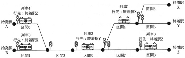 (1)各列車は,あらかしめ決められた始発駅から,あらかじめ決められた終着駅を 行先として,路線を後戻りすることなく進行する。 (2)一つの区間には,同時に一つの列車しかいることができない。 (3)各区間の入口には信号機があり,赤又は緑を表示する。 (4)各列車は,終着駅を出口とする区間にいるときは無条件に進行できる。 終着駅を出口とする区間にいる列車が進行した場合,その列車は路線上から取り除かれる。 (5)各列車は,現在いる区間の出口で接続する区間(以下,次区間という)が次の 条件をいずれも満たしたとき,次区間に進行できる。