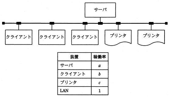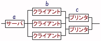 問14 稼働率を表す計算式図のように,1台のサーバ,3台のクライアント及び2台のプリンタが LAN で接続されている。 このシステムはクライアントからの指示に基づいて,サーバにあるデータをプリンタに出力する。 各装置の稼働率が表のとおりであるとき,このシステムの稼働率を表す計算式はどれか。 ここで,クライアントは3台のうちどれか1台でも稼働していればよく, プリンタは2台のうちどちらかが稼働していればよい。 ![]() ウ a(1−b)3(1−c)3 エ a(1−(1−b)3)(1−(1−c)2) 解説