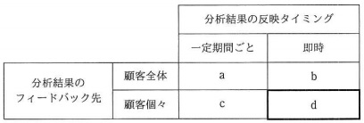 問64 ビッグデータの活用事例ビッグデータの活用事例を,ビッグデータの分析結果のフィードバック先と反映タイミングで 分類した場合,表中の d に該当する活用事例はどれか。