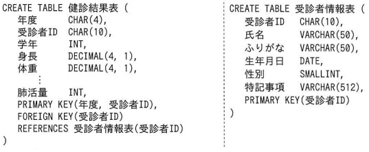 定期健康診断のデータが登録されているデータベースに関する次の記述を読んで, 設問1〜3に答えよ。 D中学校では,年に1回,定期健康診断を実施し,結果をデータベースに登録している。 身長と体重の測定結果は,身長の単位は cm,体重の単位は kg として,いずれも 0.1 刻みで健診結果表に登録している。定期健康診断を受ける生徒の生年月日, 性別などの属性情報は,受診者情報表に登録している。 健診結果表を作成する SQL 文の一部と,受診者情報表を作成する SQL 文を次に示す。