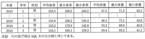 ![]() 図1 体格推移表 a に関する解答群 エ = '2Ø1%' オ = '2Ø1_' カ = '2Ø1*' b に関する解答群 エ '女' オ '−' c に関する解答群