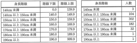 図2に示す身長階級表を作成し,これに対応させて,2019 年度の男子生徒の 定期健康診断データを基に,図3に示す身長度数分布表を作成したところ, “人数が相違している”との指摘があった。