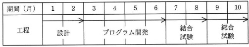 仕様変更を行っても,開発を進めている機能 L のプログラムを変更する必要はなく, 機能 L の当初計画の開発規模の 10 %の追加開発が必要と分かった。 また,仕様変更分における工程ごとの生産性は,当初計画と同じである。仕様変更に関わる, 設計工程から結合試験工程までは,当初計画分と切り離して実施可能であり, この期間に必要な追加の工数は d 人月となる。 開発チーム1では,仕様変更分の総合試験の実施に関して,次の二つの計画を検討した。 ・計画1 仕様変更分の総合試験は,当初計画分の総合試験の開始時点から実施する。 ・計画2 仕様変更分の総合試験は,当初計画分の総合試験の5週目開始時点から実施する。 仕様変更に関わる,設計工程から結合試験工程までの期間は,刷新プロジェクトの 開始後 17 週目開始から,計画1又は計画2の総合試験工程の開始前までとする。 総合試験工程は,図1のスケジュールで示した当初計画どおりに完了させる。 ここで,仕様変更分の開発に必要な追加の要員数は,設計工程から結合試験工程までの 期間の各週で同一とする。また,追加の要員は,全ての工程を担当できるスキルを備えているものとする。 計画1の場合は刷新プロジェクトの開始後 e 週目終了までに, 計画2の場合は刷新プロジェクトの開始後 36 週目終了までに,結合試験工程を完了させる必要がある。 仕様変更に関わる,設計工程から結合試験工程までの期間の各週に必要な追加の要員は, 計画1の場合は少なくとも f 人, 計画2の場合は少なくとも g 人である。 追加可能な要員が各週とも最多4人である場合,h 。 前記の影響調査結果も踏まえて変更管理会議を開催し,仕様変更依頼を採用することになった。 c に関する解答群 イ 開発チーム2 ウ 開発チーム3 エ 開発チーム1及び開発チーム2 オ 開発チーム2及び開発チーム3 カ 開発チーム2及び開発チーム3 キ 全ての開発チーム d に関する解答群 e に関する解答群 f,g に関する解答群 オ 5 カ 6 キ 7 ク 8 h に関する解答群 イ 計画2だけが実現可能である ウ 両計画とも実現可能である エ 両計画とも実現不可能である