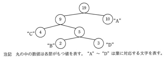 (2) 文字の出現回数表に基づいてハフマン木を作成する。 ハフマン木の定義は,次のとおりである。