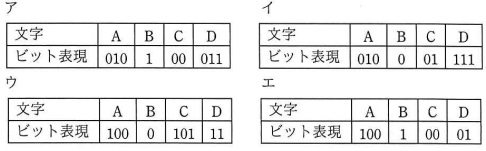 問08 必須問題ハフマン符号化を用いた文字列圧縮に関する次の記述を読んで,設問1〜3に答えよ。 “A”〜“D”の4種類の文字から成る文字列をハフマン符号化によって圧縮する。 ハフマン符号化では,出現回数の多い文字には短いビット列を,出現回数の少ない文字には 長いビット列を割り当てる。ハフマン符号化による文字列の圧縮手順は,次の (1)〜(4) のとおりである。 (1) 文字列中の文字の出現回数を求め,出現回数表を作成する。例えば,文字列 “AAAABBCDCDDACCAAAAA”(以下,文字列αという)中の文字の出現回数表は,表1のとおりになる。