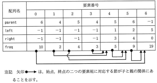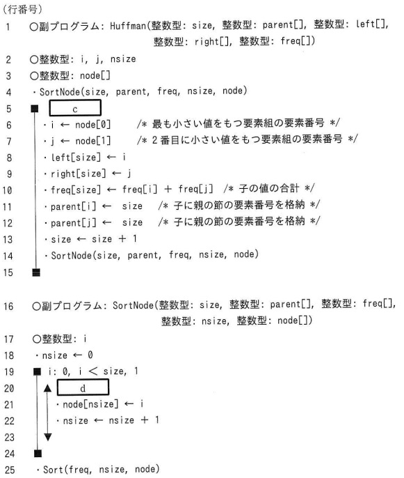 ![]() 図3 図1に示したハフマン木を表現する四つの配列 (3) 副プログラム Huffman は,次の@〜Dを受け取り,ハフマン木を表現する配列を作成する。 @ 葉である節の個数 size A 初期化された配列 parent B 初期化された配列 left C 初期化された配列 right D 初期化された後,文字の出現回数が要素番号 0 から順に格納された配列 freq (4) 副プログラム SortNode は,親が作成されていない節を抽出し,節の値の昇順に整列し, 節を表す要素組の要素番号を順に配列 node に格納し,その個数を変数 nsize に格納する。 行番号 19〜24 で親が作成されていない節を表す要素組の要素番号を抽出し, 行番号 25 で節の値の昇順に整列する。 (5) 副プログラム Sort(プログラムは省略)は,節を表す要素組の要素番号の 配列 node を受け取り,要素番号に対応する要素組が表す節の値が昇順となるように整列する。 節の値が同じときの順序は並べ替える直前の順序に従う。 (6) 副プログラム Huffman,SortNode 及び Sort の引数の仕様を,表2〜4に示す。