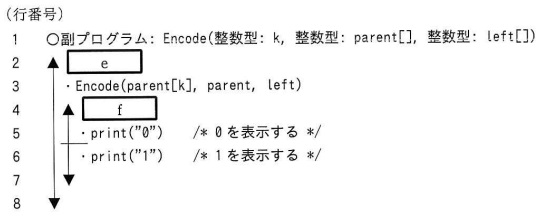(3) 副プログラム Encode は,行番号 2 の条件が成り立つとき,副プログラム Encode を再帰的に呼び出す。 これによって,ハフマン木を葉から根までたどっていく。 (4) 根にたどり着くと次は葉に向かってたどっていく。現在の節が親の左側の子のときは 0 を, 右側の子のときは 1 を表示する。 (5) 関数 print は,引数で与えられた文字列を表示する。 〔プログラム2〕