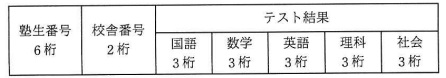次の COBOL プログラムの説明及びプログラムを読んで,設問1,2に答えよ。 〔プログラムの説明〕 地域の5か所に建物(以下,校舎という)をもち,中学生向けの進学指導を行っている P 学習塾では, 定期的にテストを実施している。全ての塾生は,国語,数学, 英語,理科及び社会の5教科のテストを受ける。 テスト結果は,1回分を学年別の結果ファイルに格納する。 各校舎の各学年には1名以上の塾生が所属しており,1学年の人数は塾全体で 999 人を超えることはない。 このプログラムは,結果ファイルに格納されたある学年のテスト結果を塾生ごとに集計して, 5教科の得点の合計(以下,合計点という)の降順に並べた順位リストを印字する。 (1) 結果ファイルは,図1に示すレコード様式の順ファイルであり,1学年分のレコードが格納されている。