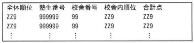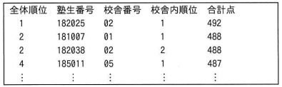 ![]() 図1 結果ファイルのレコード様式 A 校舎番号には,塾生番号で示される塾生が所属する校舎の番号が 01〜05 で格納されている。 B テスト結果には,塾生番号で示される塾生の各教科の得点が 000〜100 で格納されている。 (2) 順位リストは,図2に示す印字様式である。見出しは印刷済みとする。 ![]() 図2 順位リストの印字様式 A 同じ合計点の塾生は同じ順位とする。例えば,塾全体で合計点の高い塾生から, 492 点が1名,488 点が2名,487点が1名いた場合は,図3のように順位付けして印字する。