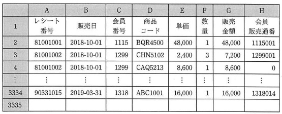 ![]() 図1 ワークシート“販売データ”の例 (1) 列 A のレシート番号は,1回の販売ごとに発行される一意の番号である。 1回の販売で複数の種類の商品を販売したときは商品コードごとに行を替えて連続して格納し, 同じレシート番号を付す。 (2) 列 B の販売日は,商品を販売した日付である。日付は,1900 年1月1日からの経過日数として記録され, 表計算ソフトの機能によって,yyyy-mm-dd(年-月-日)の形式で表示される。 (3) 列 C の会員番号は,1001 〜 9999 の一意の数値である。 (4) 列 D の商品コードは販売した商品の商品コード,列 E の単価は販売単価, 列 F の数量は販売数量,列 G は販売金額(単価×数量)である。 (5) 列 H の会員販売通番は,上位 4 桁を会員番号,下位 3 桁を会員ごとの販売の 通番とする 7 桁の数値である。会員ごとの販売の通番は, 行 2 から当該行までに格納された当該行の会員番号をもつ会員に対する販売回数であり, 1,000 未満である。ただし,同じレシート番号が続くときの二つ日以降の当該セルの値は 0 である。 (6) 同じレシート番号をもつ販売データの販売日及び会員番号は,全て同じである。 (7) 販売データは 9,998 件以下であり,販売データが入力されていない行の各セルには, 空値が格納されている。 〔ワークシート:会員管理〕 ワークシート“会員管理”には,ワークシート“販売データ”のデータを基に,会員への販売状況や, 販売促進キャンペーンのための情報を格納する。ワークシート“会員管理”の例を,図2に示す。