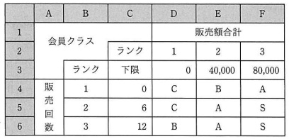 ![]() 図3 ワークシート“分類表” @ セル D2 〜 F2 には販売額合計のランクを示す値が,セル D3 〜 F3 には販売額合計を セル D2 〜 F2 のランクに分類するときの販売額合計の下限が格納されている。 A セル B4 〜 B6 には販売回数のランクを示す値が,セル C4 〜 C6 には販売回数を セル B4 〜 B6 のランクに分類するときの販売回数の下限が格納されている。 B セル D4 〜 F6 には,当該セルの属する販売額合計と販売回数のランクから決まる会員クラスを 示す“S”,“A”,“B”,“C”のいずれかが格納されている。